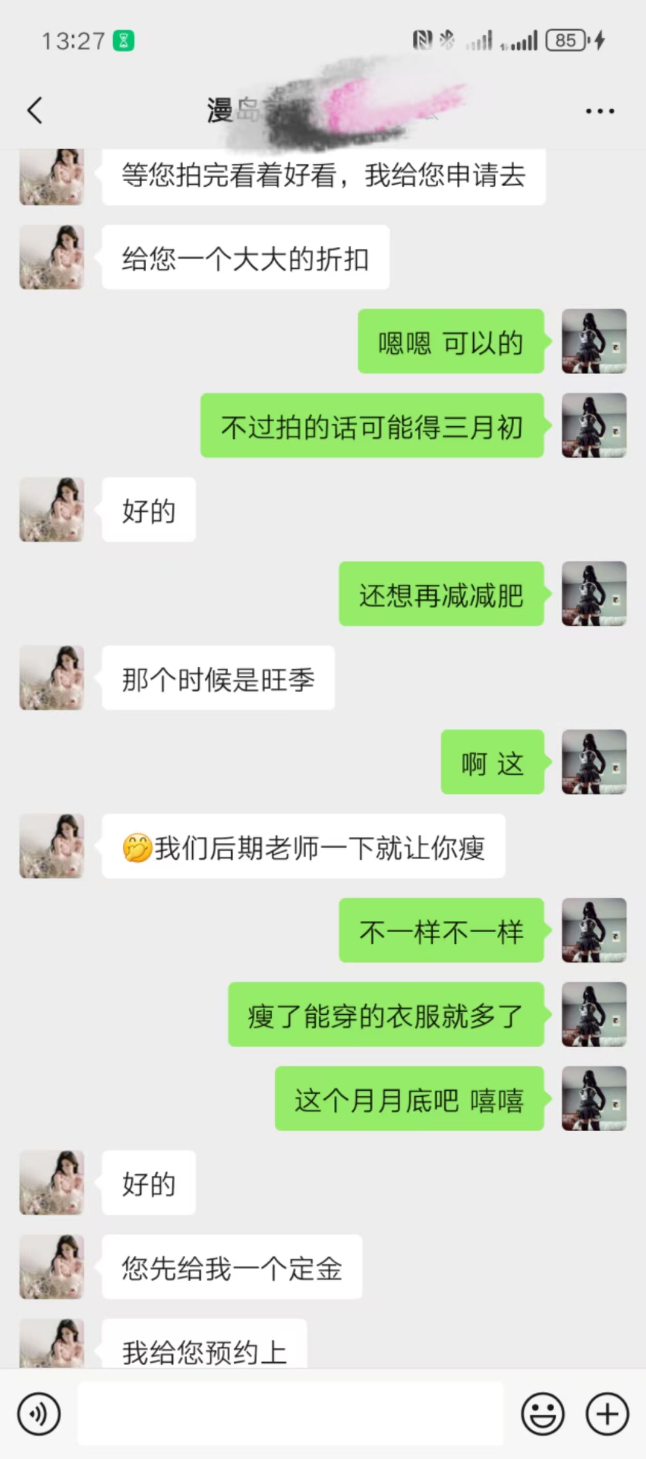 周末的时候,另外一个写真馆的小姐姐给发了条消息,婚纱照价格 1699。不得不说,这个价格真的是实惠啊。然而,拍婚纱照也不现实。就问了下其他的写真套餐。最终选了一个 799 的,有的时候就是这么容易心动。跟小姐姐说预计三月份拍的时候,她说三月份人就多了,当然,这可能是套话,意思还是让自己赶紧去消费。说自己在减肥的时候,她表示后期老师可以瞬间让自己变苗条:
