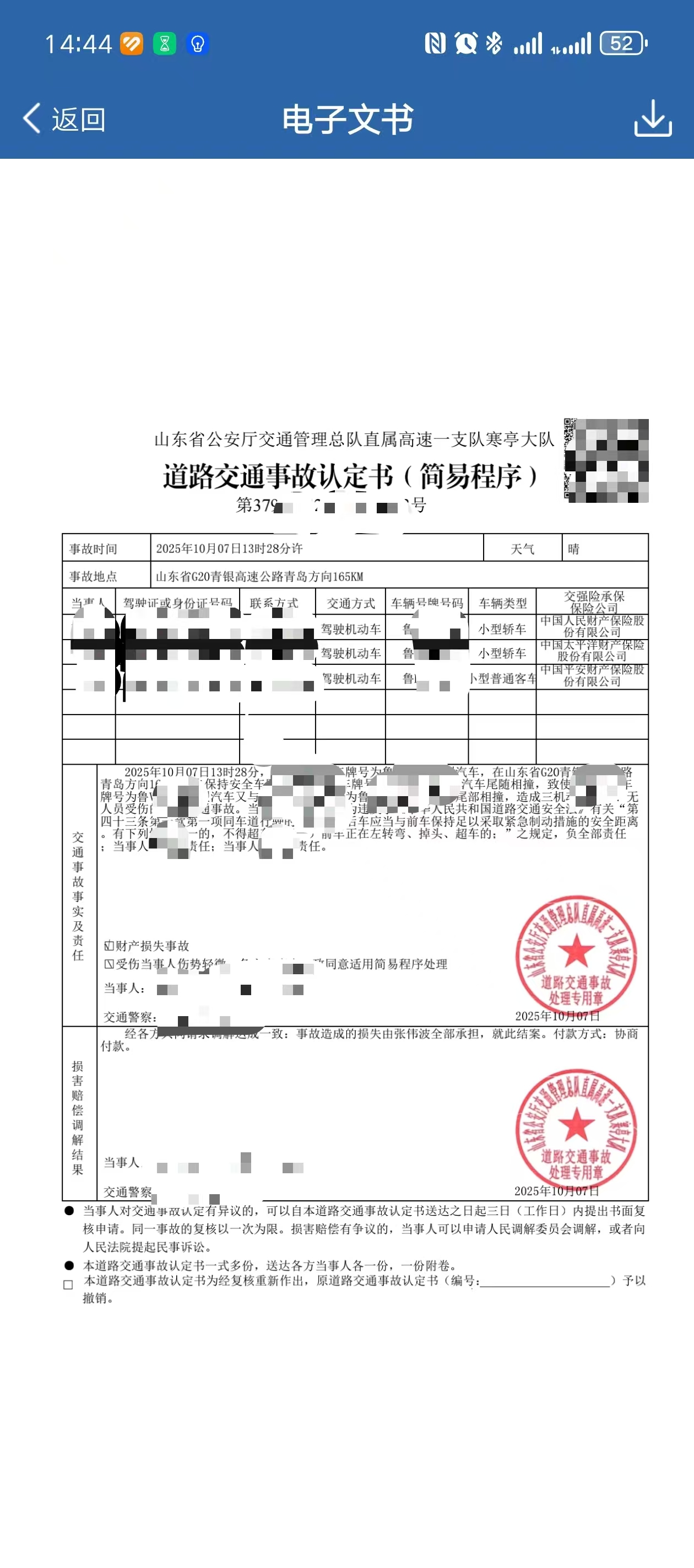 好在交警来的还算比较快,让去寒亭交警大队开具事故认证书。交警问有没有行车记录仪,让把卡拿过去,于是把后面行车记录仪的卡拿了过去。结果插上去一通操作,说读不了。等我拿回来插到行车记录仪,想用手机链接下载视频的时候发现内存卡已经损坏了。艹,tmd 京喜!!