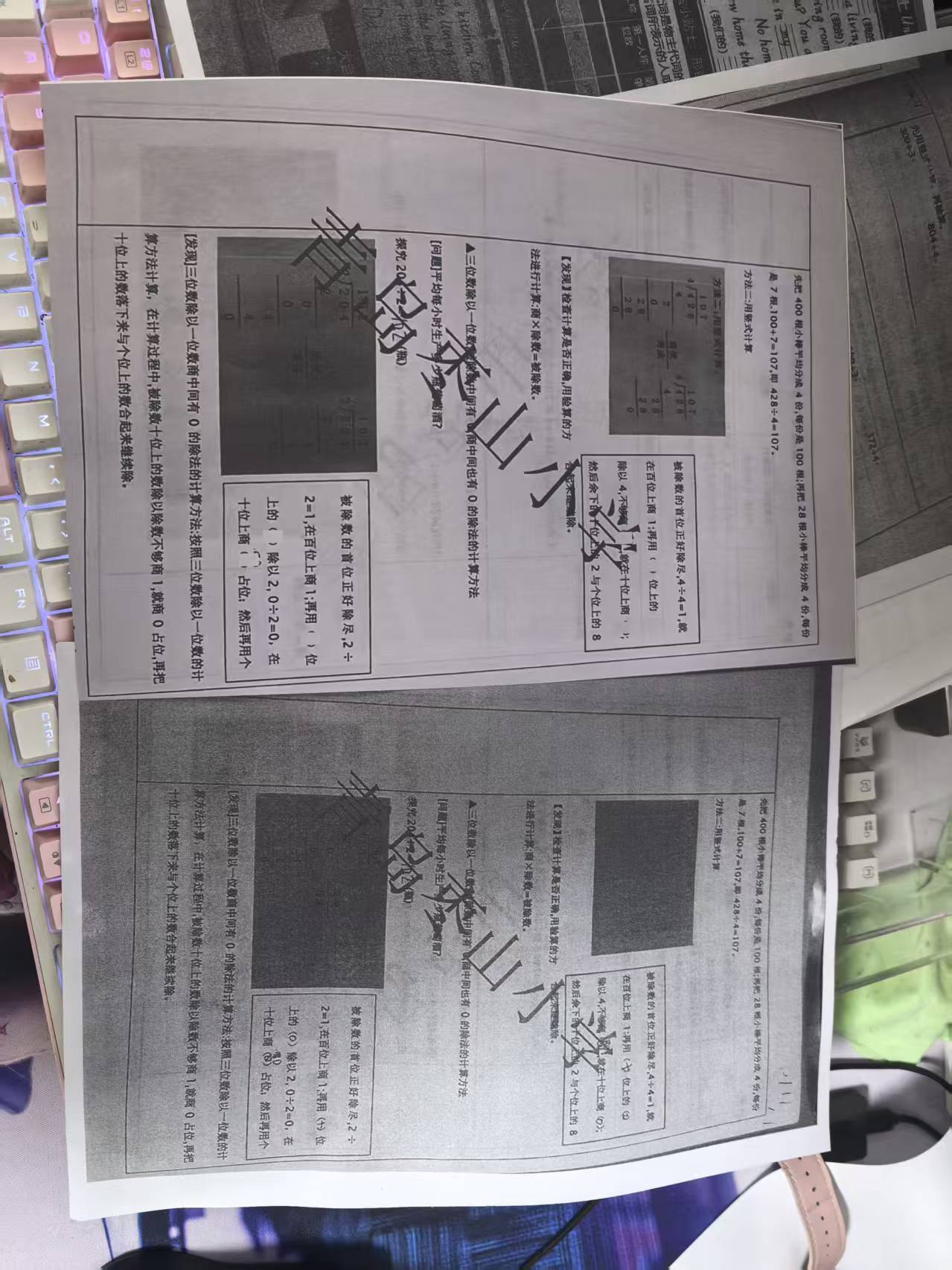 不过虽然折腾了不少,但是实际做了就一页内容,晚上回家重新打印作业,用ps把上面的内容扣掉,然后打印出来再做,对比下效果就会发现,一块钱一页打印的内容,黑色区域连算式都看不清楚(左侧石我重新打印的),怎么做?